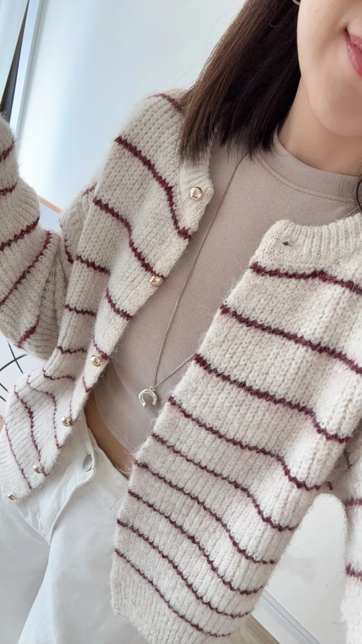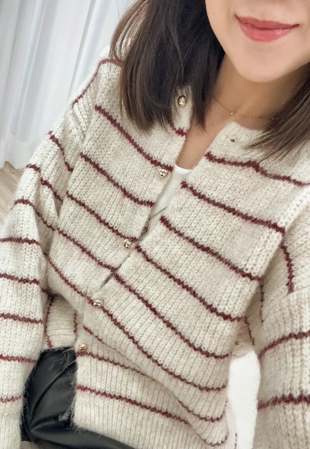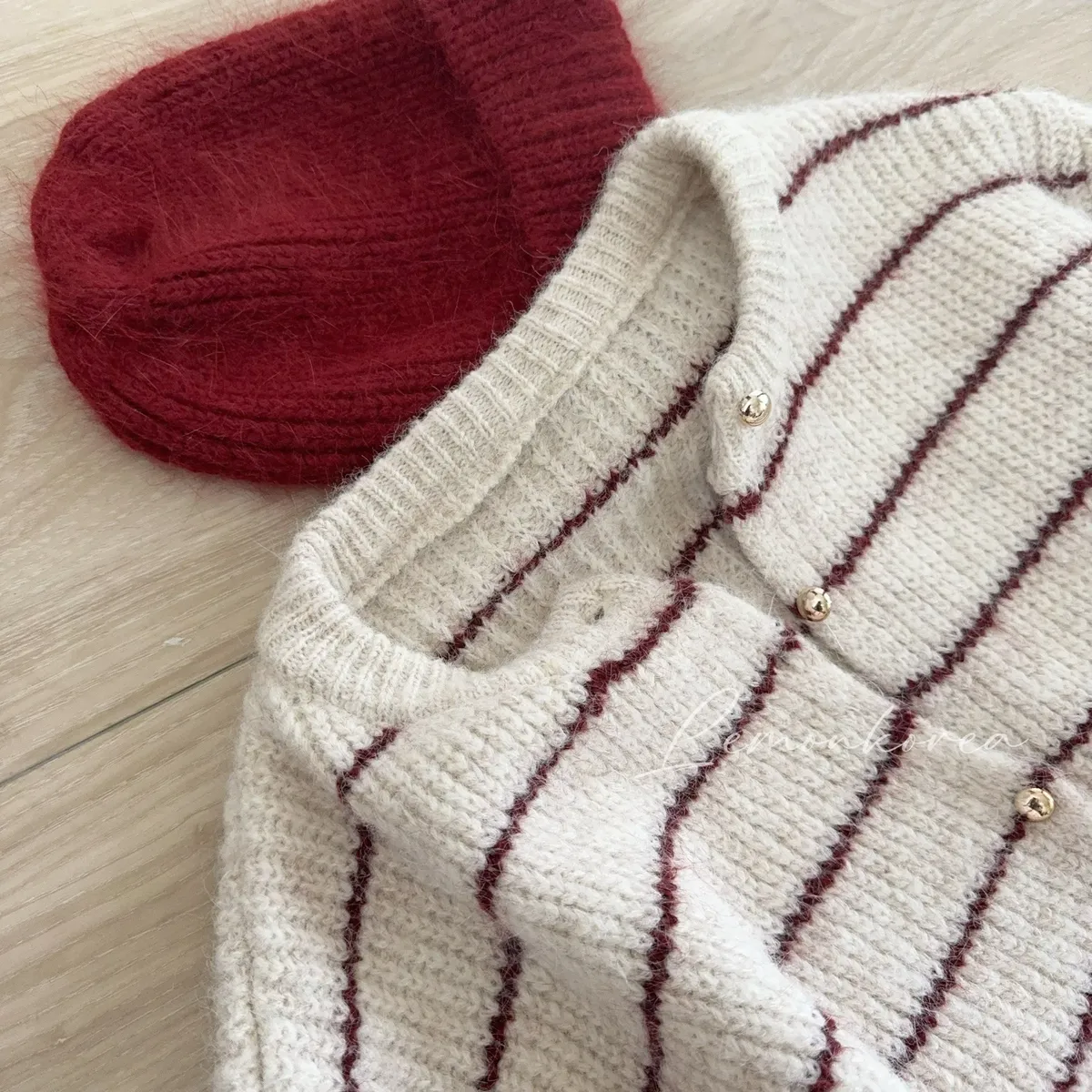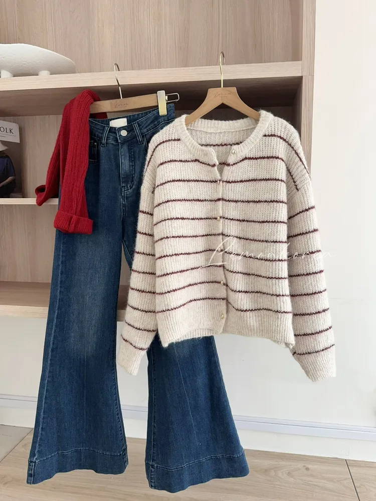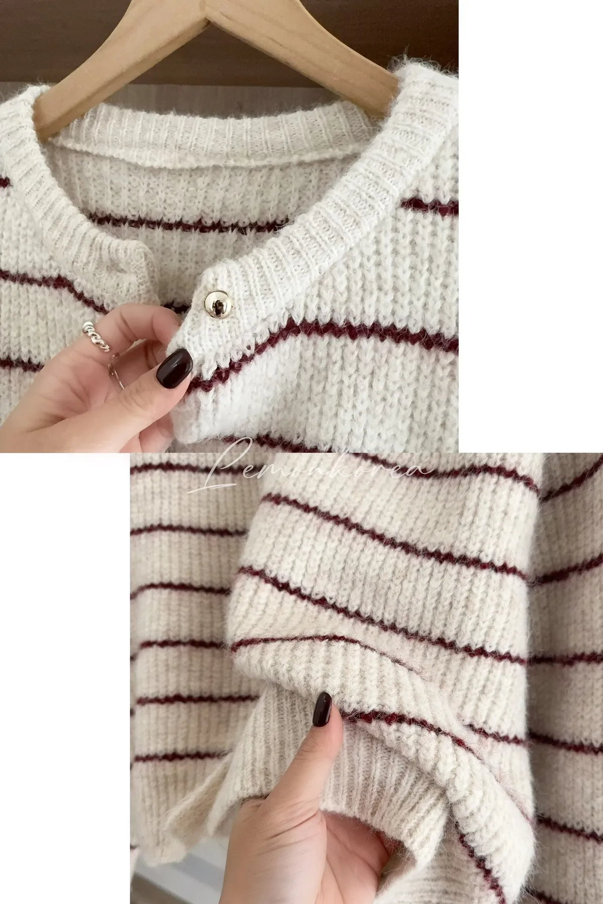毛針織料 我們都太愛這件條紋針織衣了❤️ 小細節~金釦點綴亮眼 真的很難讓人不看見它耶!! 耐看的細線條紋設計更顯視覺顯瘦 材質鬆軟不紮膚 擔心女孩可以內裡再加件衣服打底 順身感不貼身的版型 長度剛剛好俐落有精神 除了當上衣穿也可以全開扣當小外套 亮眼顯色紅條紋好難讓人抗拒 這件肯定是要收進衣櫃啦~